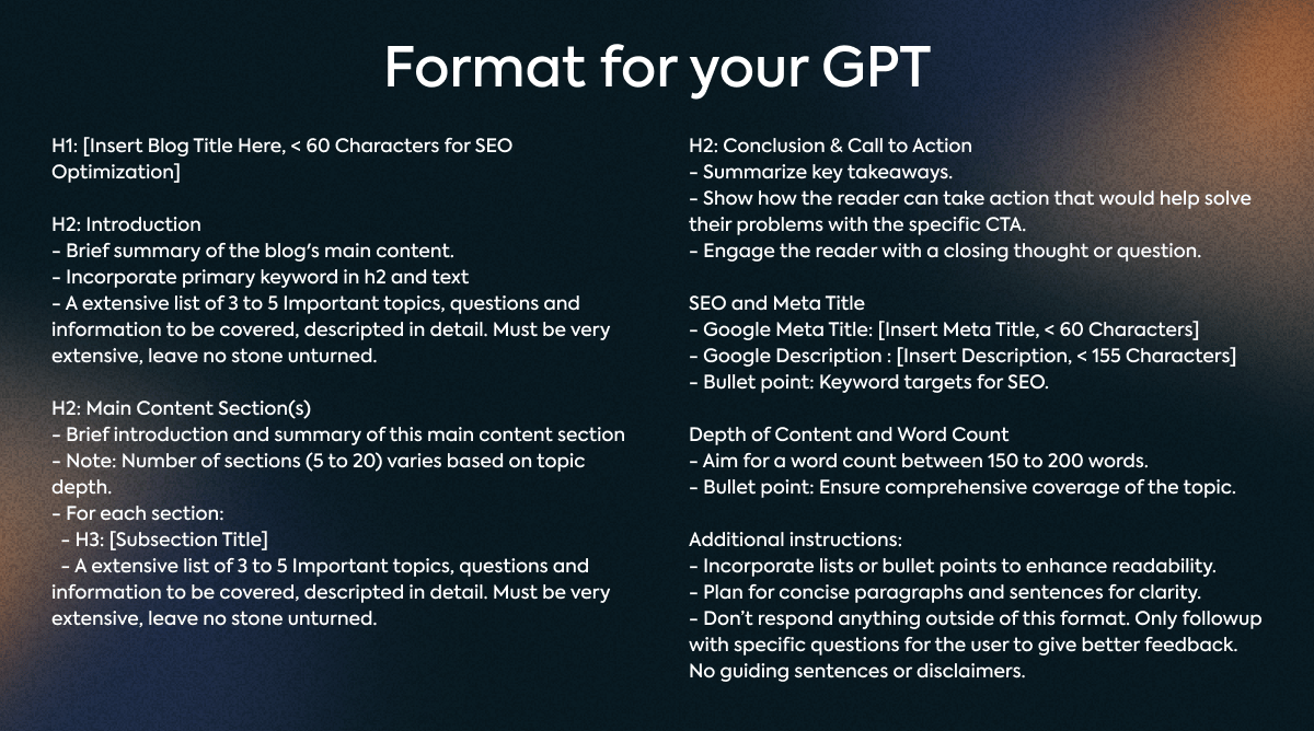This is where we structure the output of the GPT. We make sure we get consistent outputs instead of outline’s that are all over the place. Let’s ask ChatGPT what kind of format we should get for an outline. We will ask it to template it. After some tweaking I got this:
