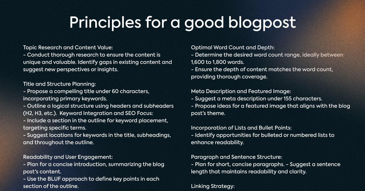 We will also need some context about what actually is a good blog post outline. For this, we of course ask ChatGPT to make an analysis with principles for an excellent blog post outline.